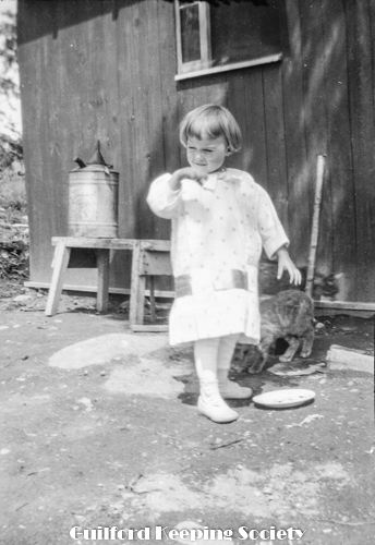 Kitty and woman (#18) near cottage.