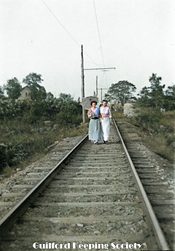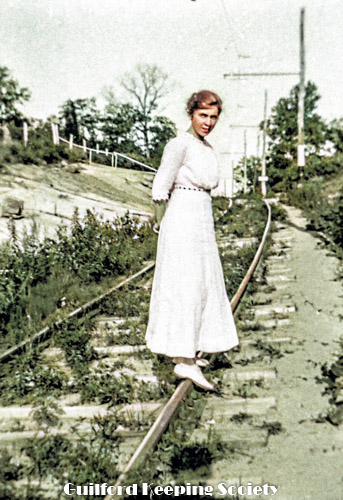 Woman friend (#26) balancing on rail of trolley tracks, possibly Sachems Head.