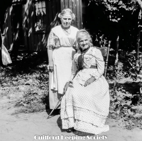 Two elderly women, one sitting in chair, at the Harrison house.
