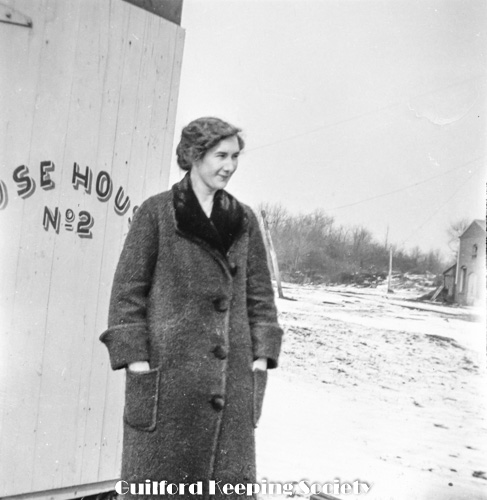 Woman standing before Hose House No.2, Fire Department with snow on the ground. Woman (#11) is possibly Eva Dadman.