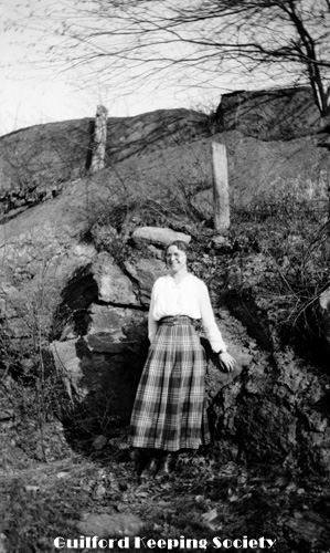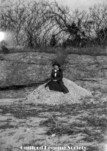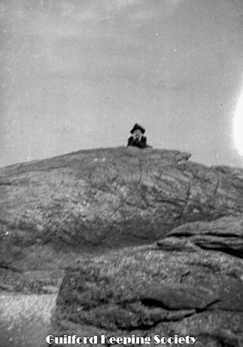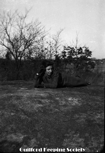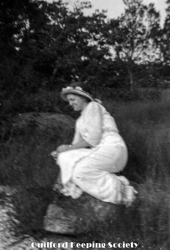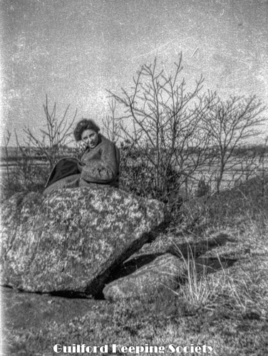 Woman friend (#3) on boulder, at the Harrison house.