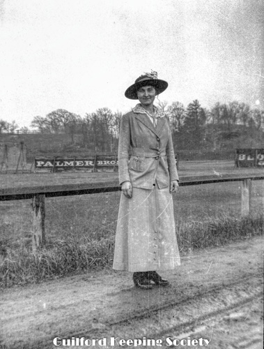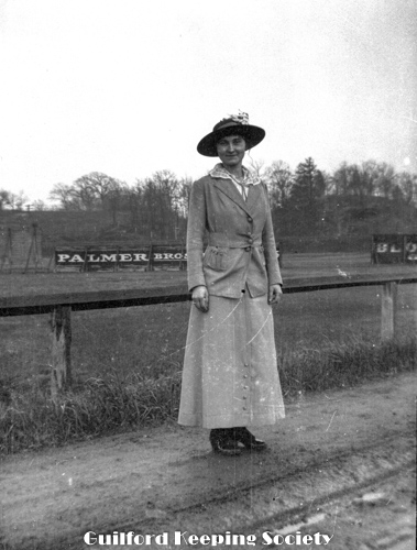Woman friend (#2), dirt road, field, advertisement signage “Palmer Bros” on back side of stands.