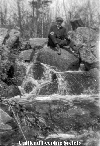 Harold Fowler on rocks over a small waterfall.