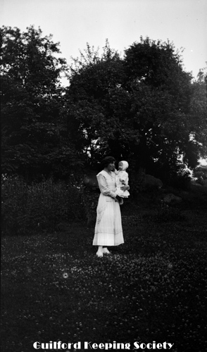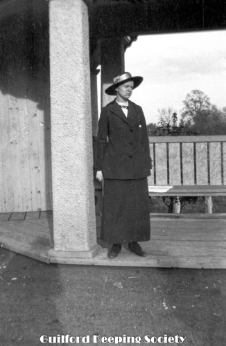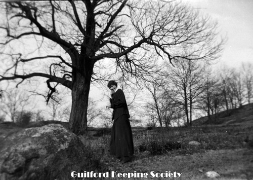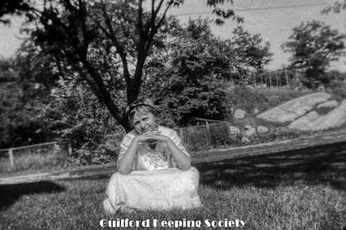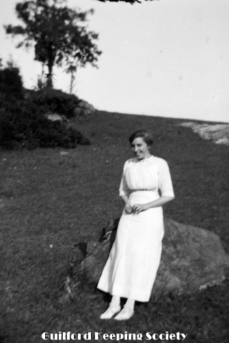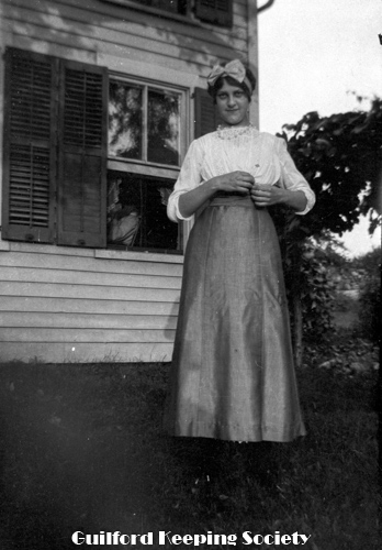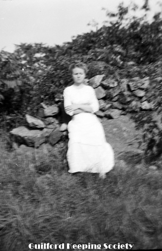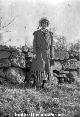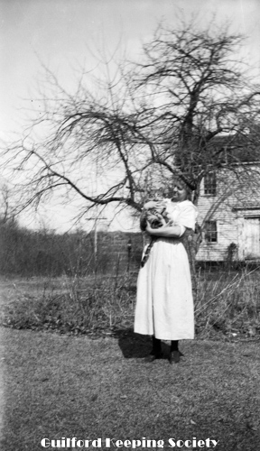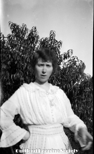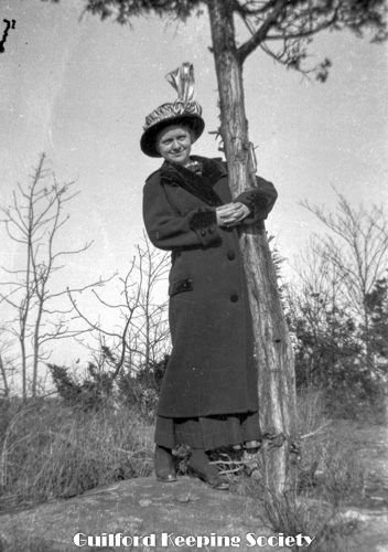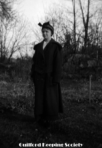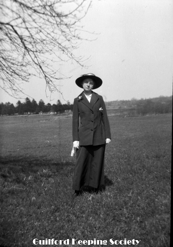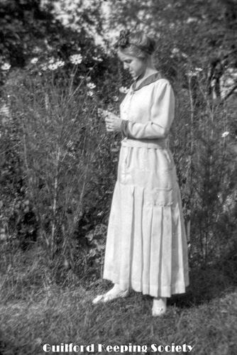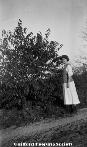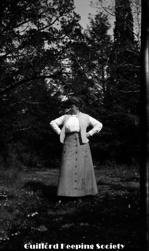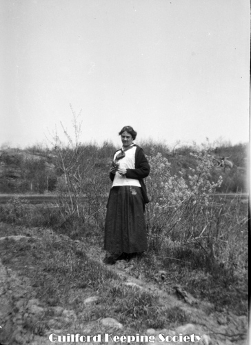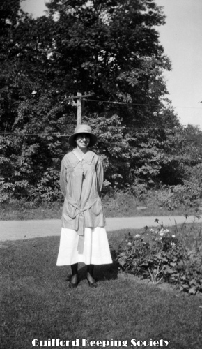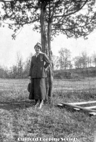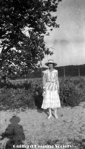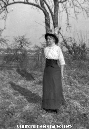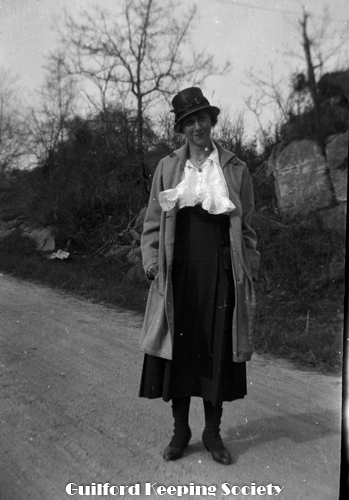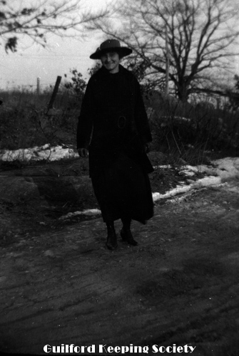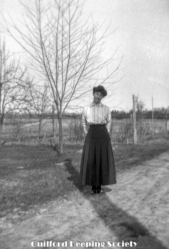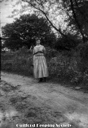 Woman (possibly Flora Jacobs Walker) standing on lawn near dirt road