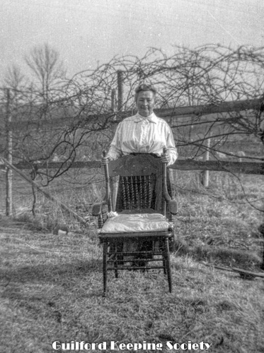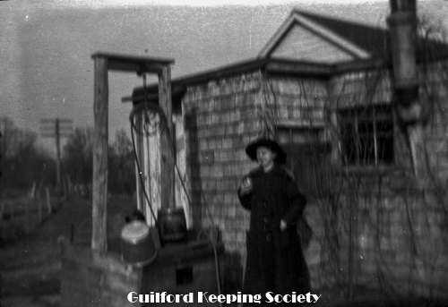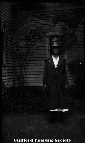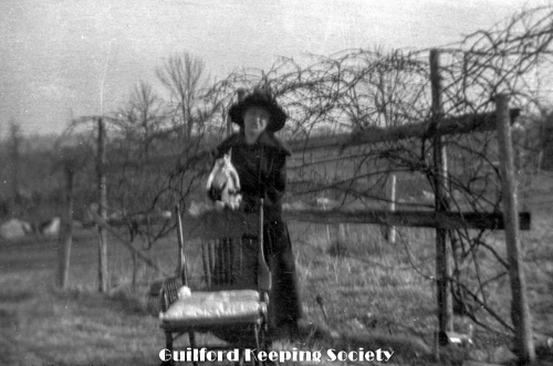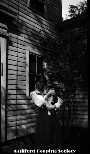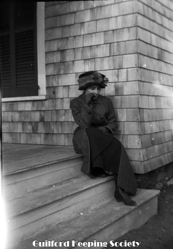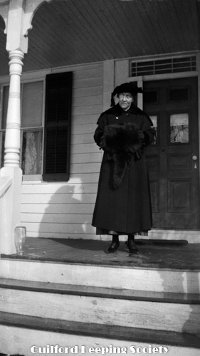 Elderly woman with fur muff, on her porch 201 Water St with upside down milk bottle. Identified as Mrs. Blatchley (CCC).