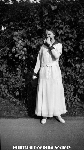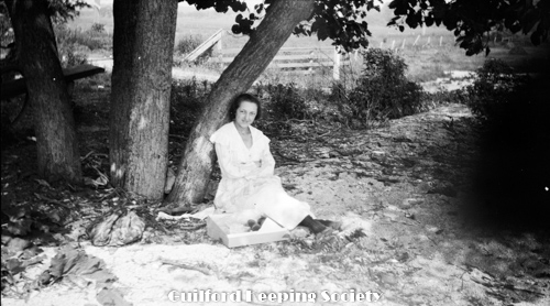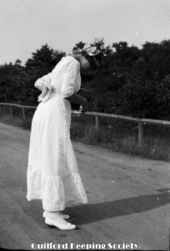 Woman on dirt roadway, possibly South Union St Wearing same outfit as earlier photo. Identified as Mrs. O’Brien (CCC).