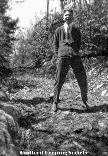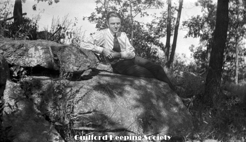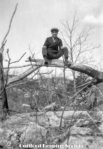 Harold Fowler sitting on a dead log over rocks.