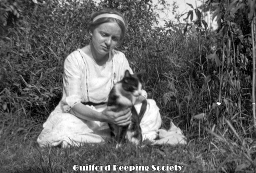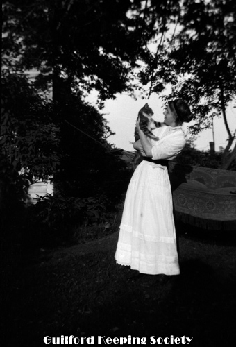 KFH with black and white cat, in yard, probably at the Harrison house.