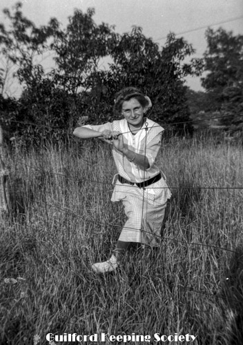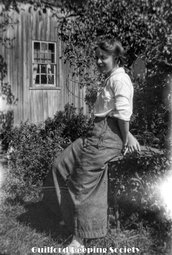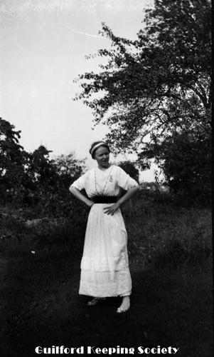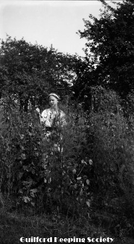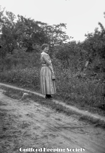 Woman in sailor blouse standing in brush near dirt road. See also #461, 462. Identified as Flora Jacobs Walker (CCC), Flora Jacobs Walker (Identification by CCC).