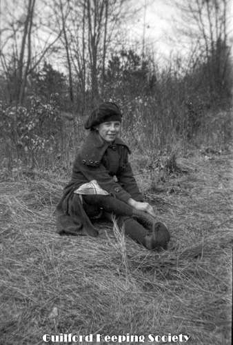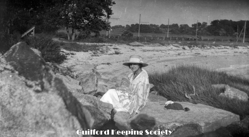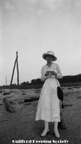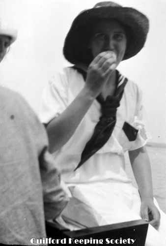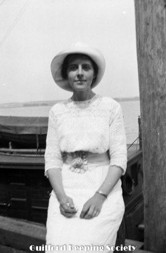 Woman in sailor top, dark hat, near boat. Possibly Flora Jacobs Walker (Identification by CCC).