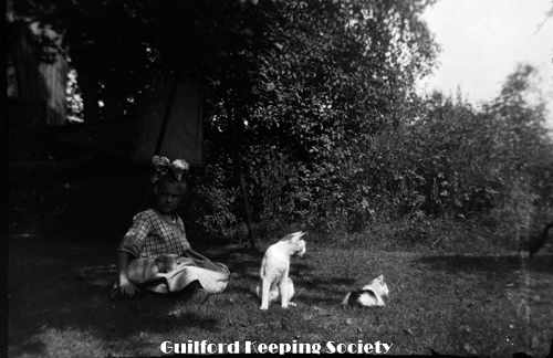 Young girl in plaid top, large bow, with two cats, at the Harrison house.