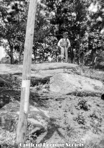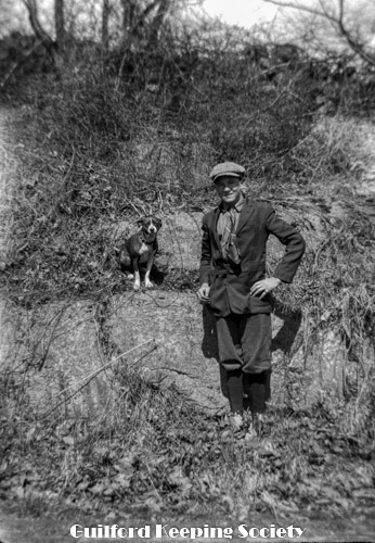 Young man (possibly a GHSB member) with tweed cap, knickers and dog on rock ledge. See also #499, 504.