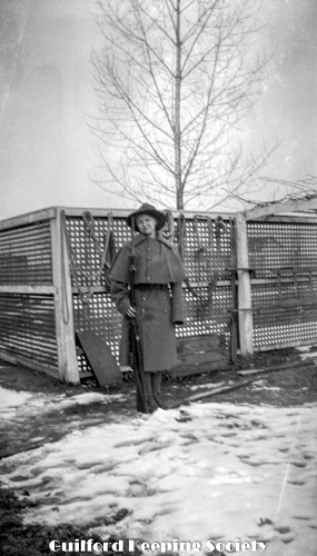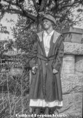KFH dressed in men’s clothing, outside the Harrison house.