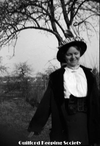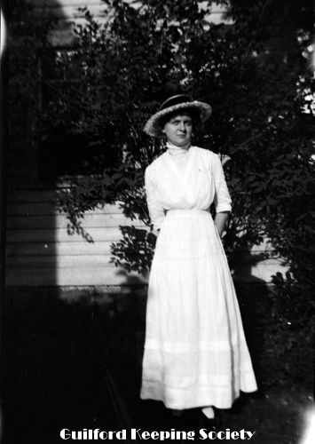 KFH in white dress, straw hat. At the Harrison house.