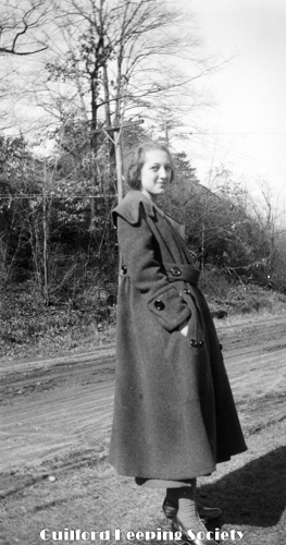 Flora Jacobs Walker standing in white eyelet dress on dirt road.