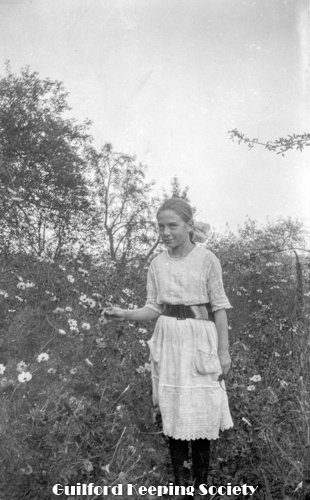 Young girl with dimple standing among wild daisies. See also #437, 460. Possibly, child of Josie Scranton Nann.