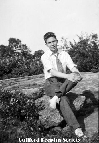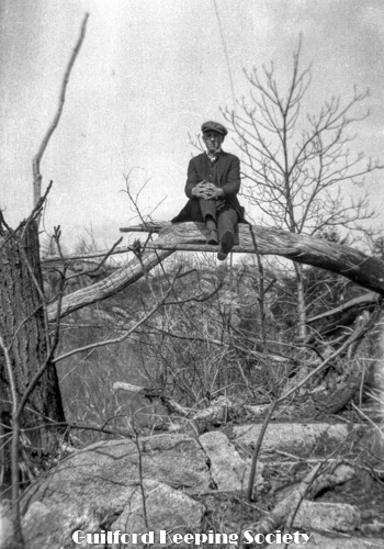 John Hubbard sitting on dead branch high above rocks. See also #489.