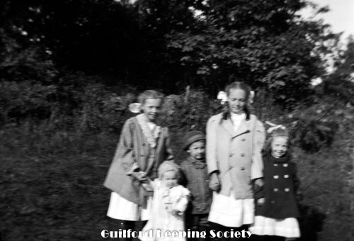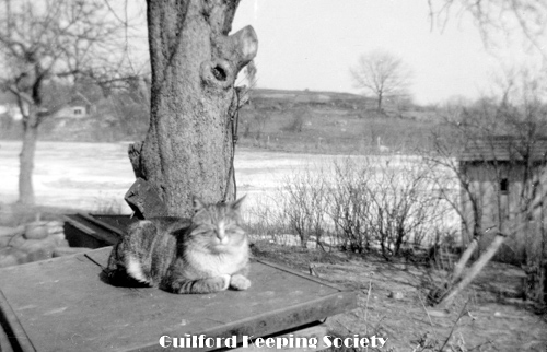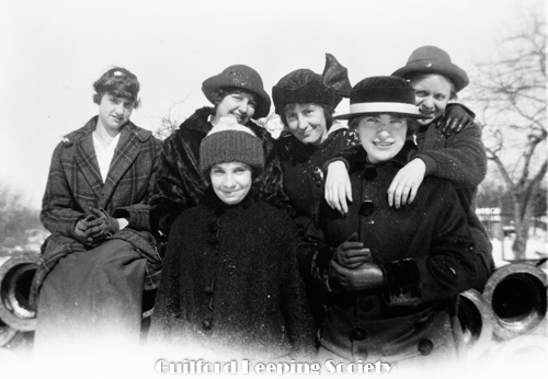 Group of 6 women sitting on a large pile of 8–10-inch diameter pipes (possible the pile of pipes for water main installation going to Sachem’s Head). Kitty in photo.