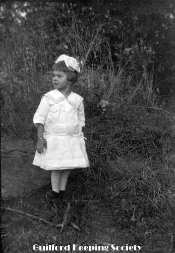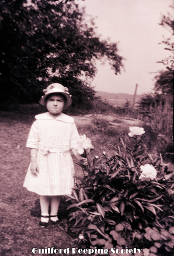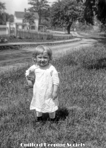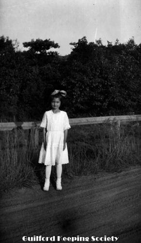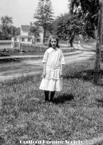 Young girl across street from a federal home with white fencing on a winding road (possibly oldest daughter of Minnie Josie Scranton Nann, in North Branford), see #571.