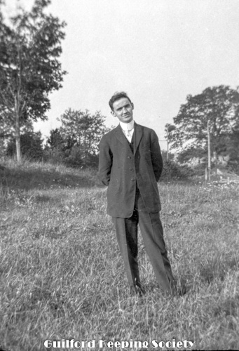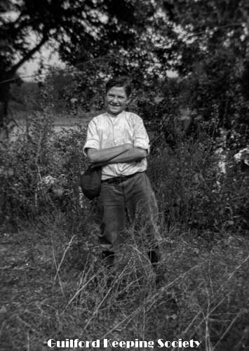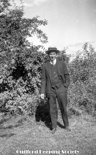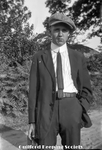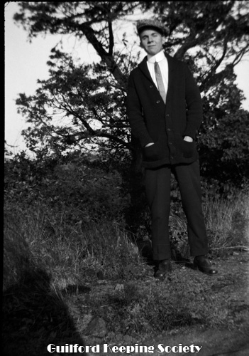 Harold Fowler, cap, long dark cardigan, striped tie, standing in brush. See, also #489.