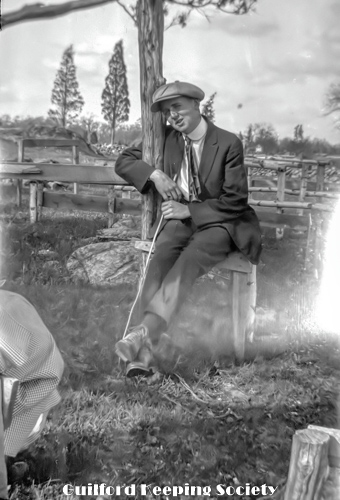 Dapper Harold Fowler with box camera sitting on fence along dirt road (possibly Water St). See also #546, 548.