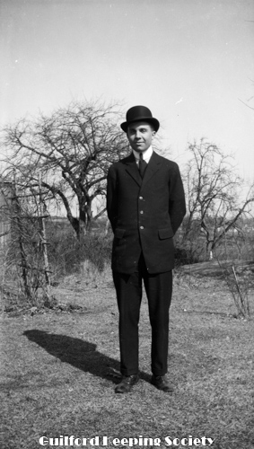 Harold Fowler dressed up in bowler hat, backyard of the Harrison house.