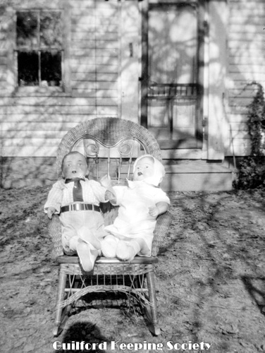Two life-sized baby dolls in rocking chair outside of Harrison house on Water St.