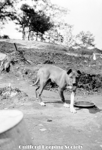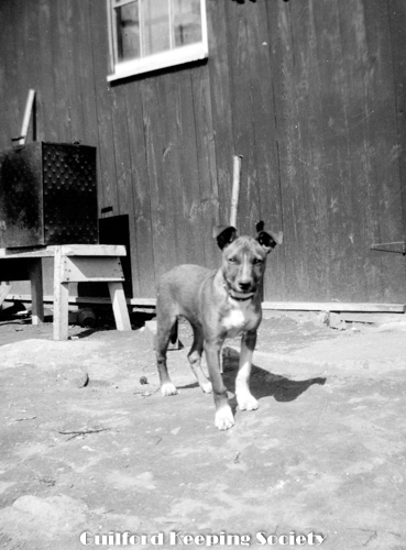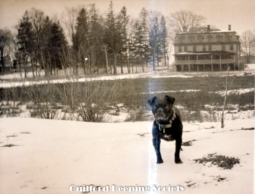 In background: Large hotel-like mansard building, 3 chimneys, over 25 windows, 4 floors, c.16 doors, stairs on both sides of porch (possibly Branford-John Hubbard ). Bull dog in foreground.