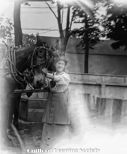 Unknown woman wearing a wedding ring on left hand, with large team of horses, slats in cupola in background left, building behind fence, possibly electric trolley wires overhead.