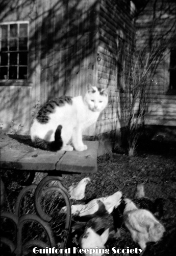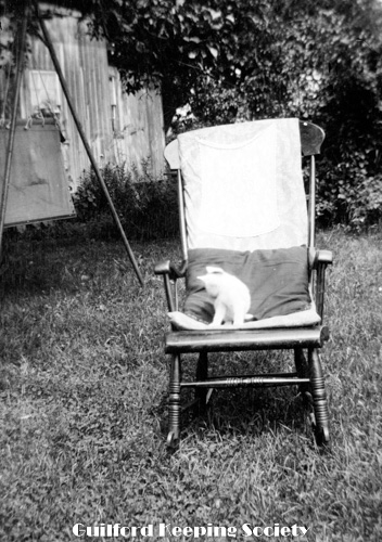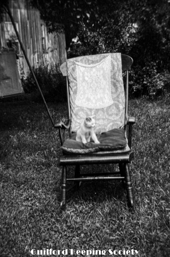 White kitten (as in #583) sitting on rocking chair, Harrison house on Water St.