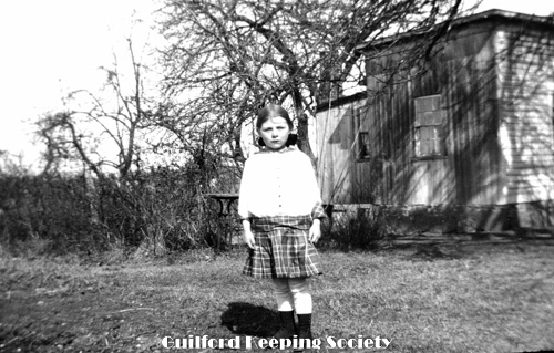 Young girl, standing aside Harrison house, in plaid skirt, sewing table as in #553.