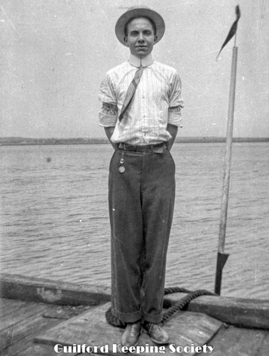 Harold Fowler standing on a dock, arm bands to hold up sleeves. See, #353, same location.