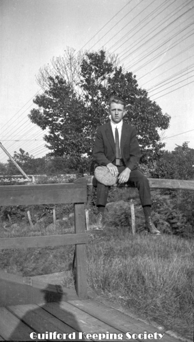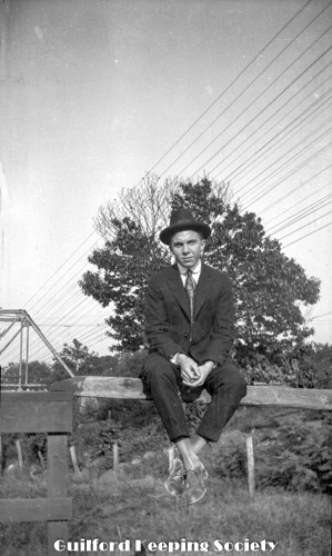 John Hubbard sitting on fence rail (see #548) holding cap, with tie, on Mulberry Point Rd bridge. Trolly bridge in background and many electrical wires that follow the railroad tracks below. Shadow of photographer visible.