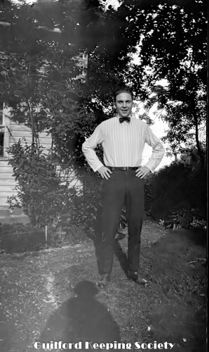 Harold Fowler, bow tie, left-hand ring, hands on hips at the Harrison house.