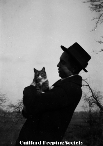 Man (possibly Charles Ward Fowler) with moustache, holding white cat. At the Harrison house.