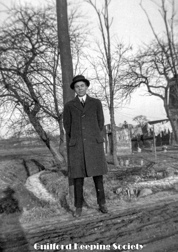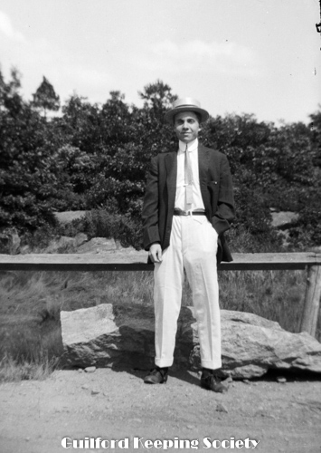 Harold Fowler standing by fence along edge of road (probably, Water St) in blazer and straw boater hat.