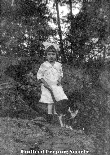 Young girl with large hair bow and bracelet on right hand, on boulders with black and white cat (see #552).