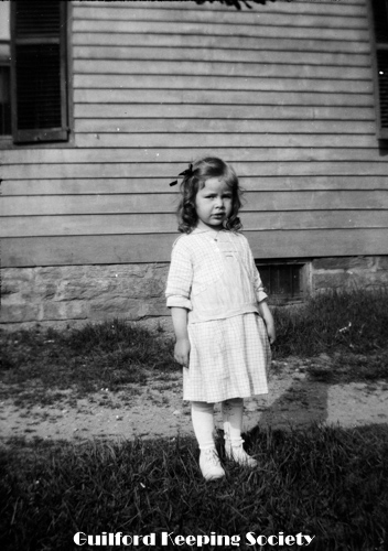 Young girl (perhaps 4-years old) standing on side of house. Not at the Harrison house. Probably not same girl in #551.