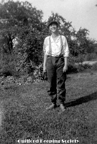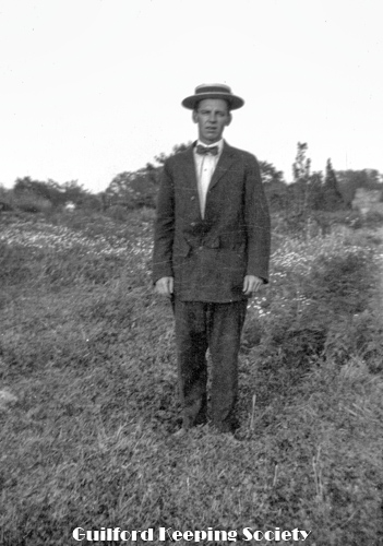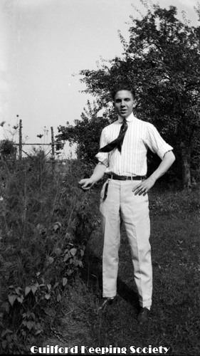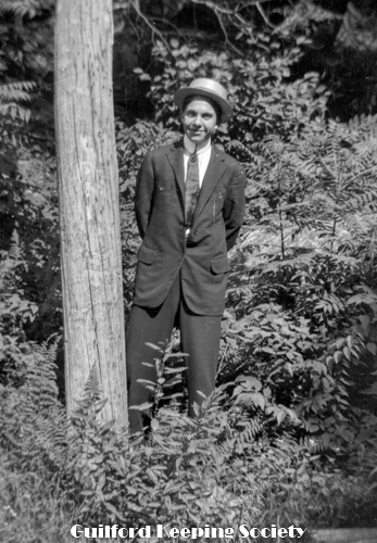 Harold Fowler “dressed up” w straw hat amidst ferns and telephone pole.