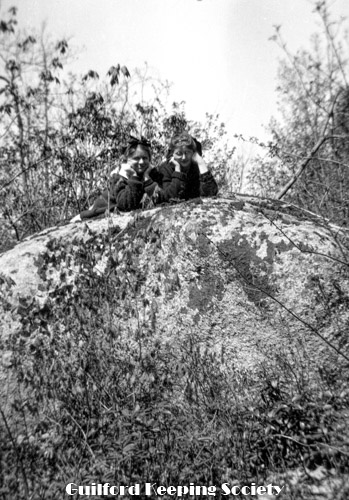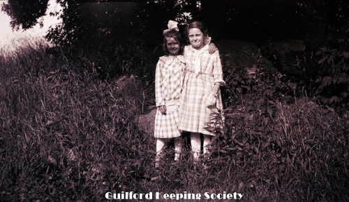 Two girls wearing plaid dresses in heavy brush with boulders. Possibly sisters (acc. to CCC).