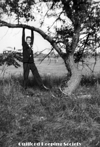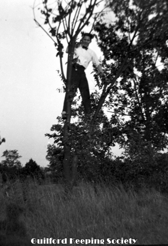 Harold Fowler, bowtie, in a tree with tall grass around.