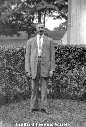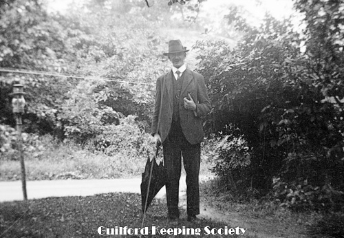 Older man (possibly Charles Ward Fowler, but no mustache), suit, standing near buildings or cottages and hedges.