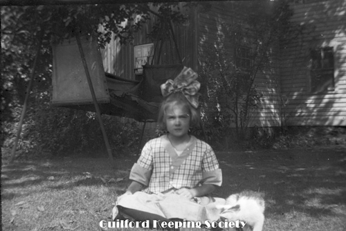 Young girl, big bow, ring left hand, on ground at Harrison’s house, with white cat. See also #552, 553, 564.