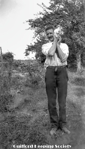 Harold Fowler dressed up near dirt road, chicken sheds, laundry in background hanging to dry. Small stream and field background. Location similar to #541.