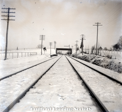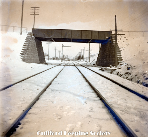 Close-up view of railroad and overhead bridge, newly landscaped Whitfield St, possibly Whitfield St