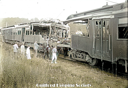 North Branford trolley wreck August 16, 1917, North Branford Route 80, just west of the of the overhead railway bridge near the trap rock quarry