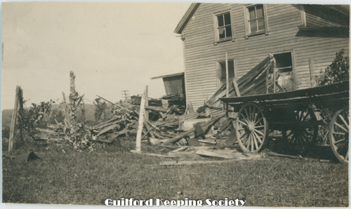 Damage at the old Hoadley homestead (Hoadley’s corner) S/W corner Route 80 & Long Hill Rd. from a tornado. Pascal K. Hoadley house property damage to barn See also P3529, 3530, 2500-203, 2500-205, 2500-206, Why Lands made and donated by Clarence Potter. Aug 31, 1920, Why Lands made and donated by Clarence Potter Why Lands page 3-3