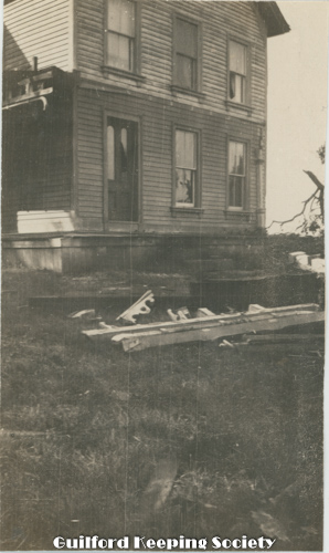 Damage at the old Hoadley homestead (Hoadley’s corner). S/W corner Route 80 and Long Hill Rd. tornado damage, closeup of side of house Pascal K. Hoadley house, owned by a Emonts in 1920 Why Lands made and donated by Clarence Potter See also P3529, 3530, 2500-203, 2500-204, 2500-205 Aug 31, 1920 Why Lands made and donated by Clarence Potter Why Lands page 3-3