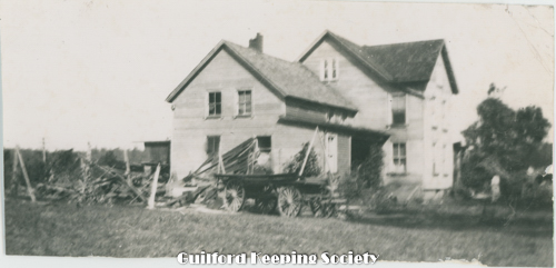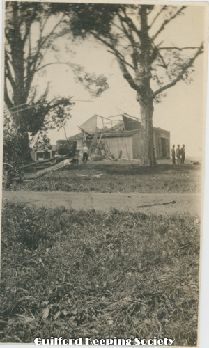 Damage at the old Hoadley homestead (Hoadley’s corner). S/W corner Route 80 and Long Hill Rd. tornado damage. Pascal K. Hoadley house, owned by A Emonts in 1920. Why Lands made and donated by Clarence Potter See also P3529, 3530, 2500-203, 2500-204, 2500-205 Aug 31, 1920, Why Lands made and donated by Clarence Potter Why Lands page 3-3