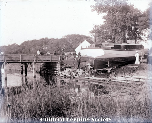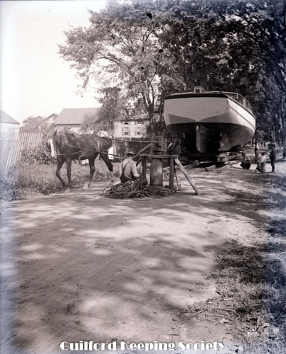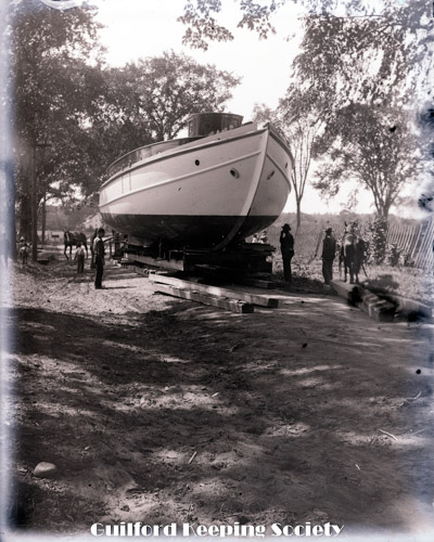 Moving boat, “Gray Dawn,” ready for launch Jones Bridge Water St